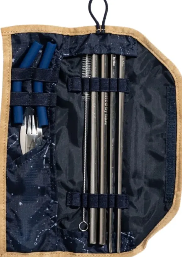 Setti sisältää yhden sporkin, kaksi ruostumattomasta teräksestä valmistettua pilliä, kaksi taitettavaa silikonikärkeä, puhdistusharjan sekä yhden parin ruostumattomasta teräksestä valmistettuja syömäpuikkoja. Mukana säilytyspussi kierrätetystä polyesteristä.