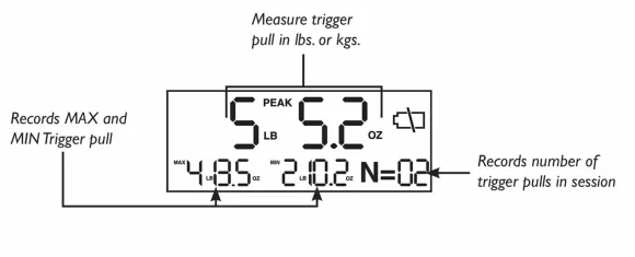 Kätevä ja tarkka digitaalinen laukaisunvastuksen mittari, jonka yksikkö on lbs ja kilo.