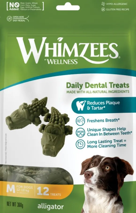 Whimzee's Alligator on täysin luonnollinen, gluteeniton ja kasvipitoinen koiran puruluu hauskassa alligaattorin muodossa. Poistaa tehokkaasti plakkia ja hammaskiveä sekä ehkäisee pahanhajuista hengitystä. Se on perunapohjainen kasvispuruluu. Whimzeen puruluussa on korkea kuitupitoisuus ja alhainen kalori- ja sokeripitoisuus. Täysin luonnollinen koiran puruluu ei sisällä keinotekoisia ainesosia. Puruluut on suunniteltu siten, että ne tehostavat ienten verenkiertoa.
