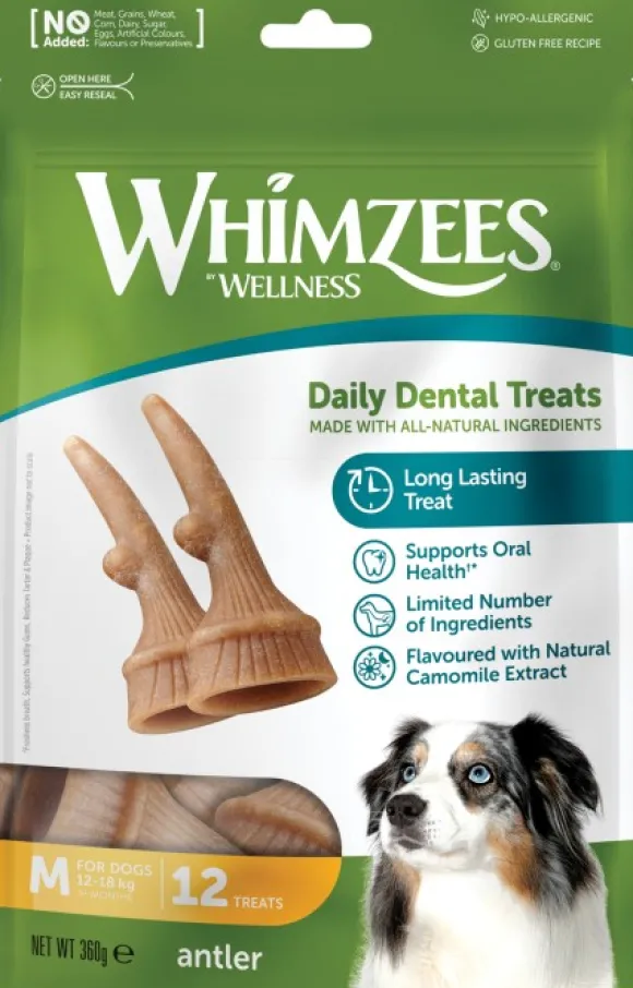 Whimzee's Occupy Antler on täysin luonnollinen, gluteeniton ja kasvipitoinen koiran puruluu hauskassa muodossa. Poistaa tehokkaasti plakkia ja hammaskiveä sekä ehkäisee pahanhajuista hengitystä. Se on perunapohjainen kasvispuruluu ilman vehnää. Whimzeen hammasharjassa on korkea kuitupitoisuus ja alhainen kalori- ja sokeripitoisuus. Täysin luonnollinen koiran puruluu ei sisällä keinotekoisia ainesosia. Puruluut on suunniteltu siten, että ne tehostavat ienten verenkiertoa. Suositellaan 12 – 18 kg koirille