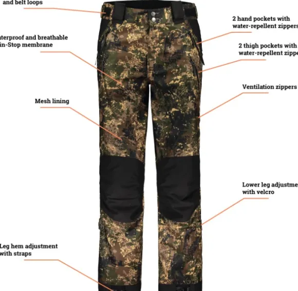 Vedenpitävällä Rain-Stop 2-layer -kalvolla varustetut Alaska Superior II -metsästyshousut aiempaa paremmalla mitoituksella ja keveydellä. Aktiiviseen metsästykseen sopivissa housuissa on kevyt verkkovuori, joka takaa käyttömukavuuden. Reisien sivuilla on ventilaatiovetoketjut ja pohkeissa ja lahkeensuissa kiristykset. Kaksi vetoketjullista reisitaskua ja kaksi vetoketjullista sivutaskua. Vettähylkivät YKK-vetoketjut. Tehokkaasti maastouttava BlindTech Invisible -väritys.