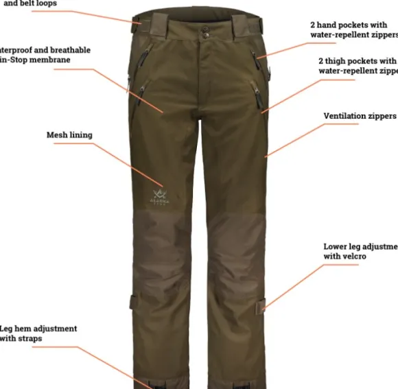 Alaska Superior II -metsästyshousut aiempaa paremmalla mitoituksella ja keveydellä. Housut sopivat erinomaisesti aktiiviseen metsästykseen. Niissä on vedenpitävä ja hengittävä Rain stop-kalvo, ventilaatiovetoketjut reisien sivuilla sekä vettähylkivät YKK-vetoketjut. Kevyt verkkovuori takaavat parhaan käyttömukavuuden ja hengittävyyden. Kaksi vetoketjullista reisitaskua ja kaksi vetoketjullista sivutaskua. Kiristykset pohkeissa ja lahkeensuissa.
