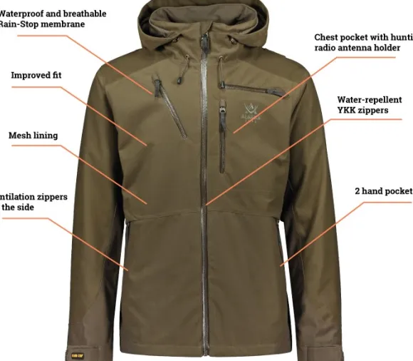 Uusitussa Alaska Superior II -metsästystakissa on nyt aiempaa parempi mitoitus ja keveys. Superior II soveltuukin erinomaisesti aktiiviseen metsästykseen. Takissa on vedenpitävä ja hengittävä Rain-Stop 2-layer -kalvo sekä kevyt verkkovuori, joka lisää hengittävyyttä ja takaa keveyden. Kyljissä on vetoketjulliset tuuletusventilaatiot. Pintamateriaali on harjattua, hiljaista kangasta. Kaksi sivutaskua, vettähylkivät YKK-vetoketjut, rintatasku radiopuhelimelle sekä antennilenkki olkapäässä. Säädettävä huppu.