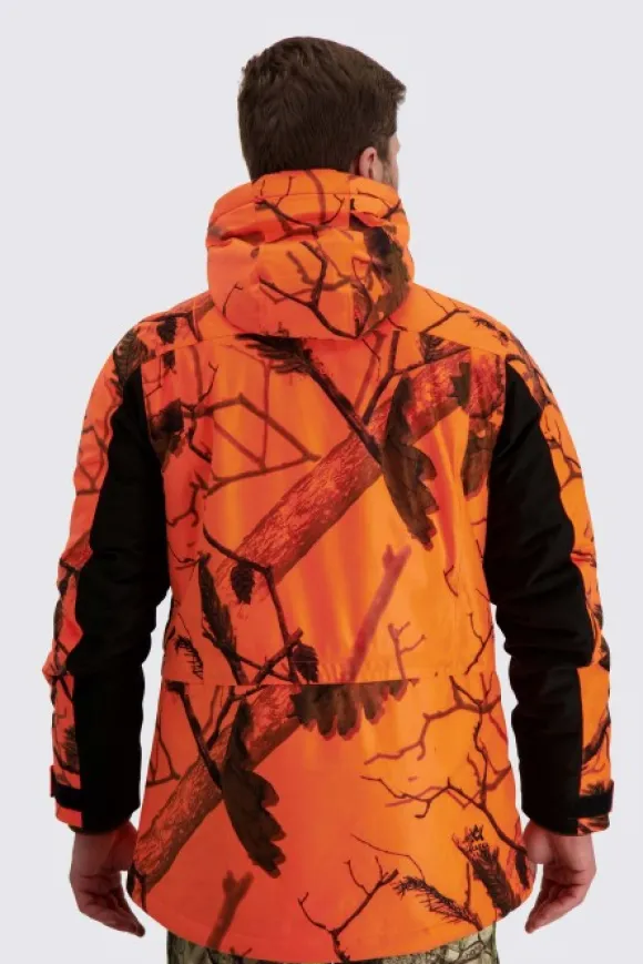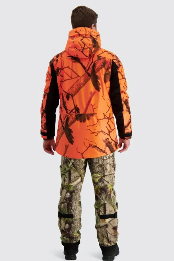 Alaska Tundra -metsästyspuku on varustettu vedenpitävällä ja hengittävällä Rain-Stop-kalvolla sekä lämpimällä SuperLoft-toppauksella. Takin pitkän mallin, housujen korkean selkäosan sekä henkseleiden ansiosta pukua on erittäin mukava käyttää. Sekä takissa että housuissa on ventilaatiovetoketjut hyvän ilmanvaihdon takaamiseksi. Taskut on suunniteltu erityisesti metsästäjän tarpeisiin. Harjattu, hiljainen pintamateriaali, vettähylkivät YKK-vetoketjut ja hyvät säätömahdollisuudet. Takin oranssi Blaze 3D -huomiocamokuvio on metsästysasetuksen mukainen ja sopii hirvijahtiin.