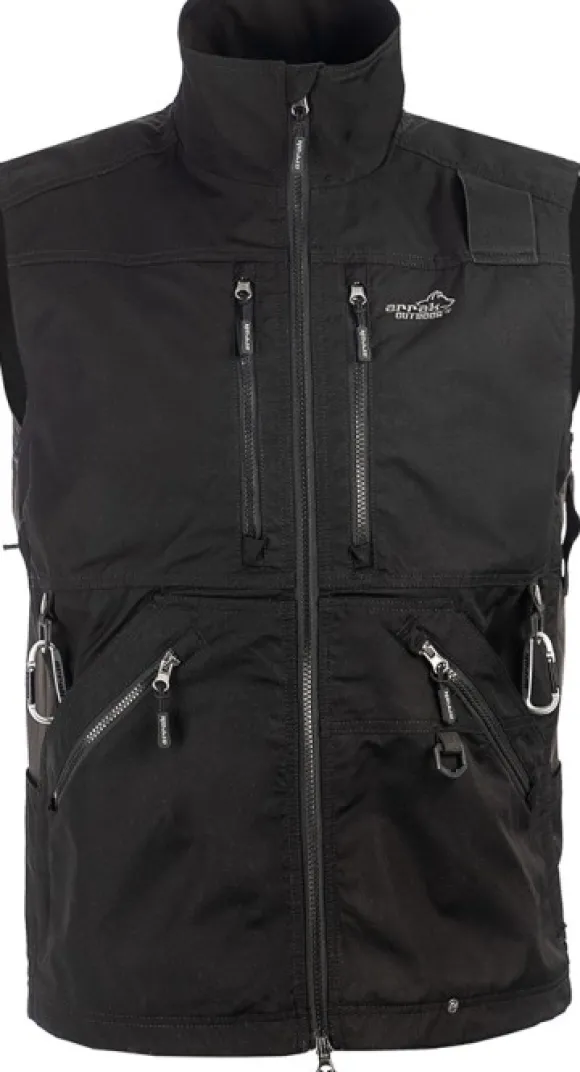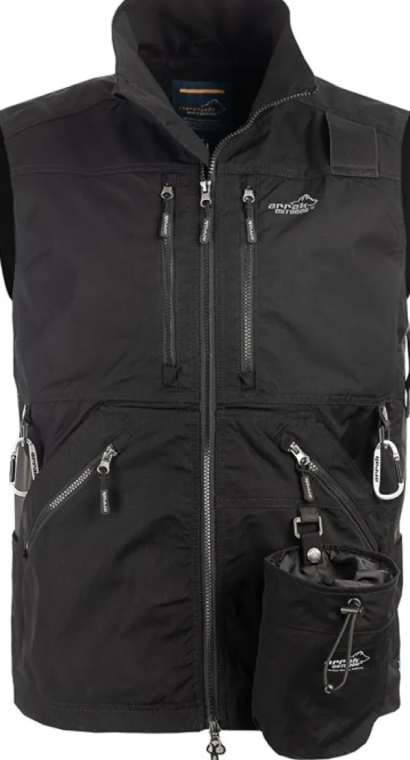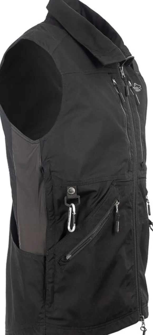 Liivi on valmistettu kestävästä polyesteri- ja puuvillamateriaalista, ja sivupaneelit ovat joustavaa materiaalia parhaan istuvuuden ja liikkuvuuden takaamiseksi. Vuorattu ohuella verkkovuorella. Liivissä on tuuletusvetoketjut sivulla, 2-suuntainen vetoketju edessä, kaksi tukevaa rintataskua ja kaksinkertainen tasku alareunassa – yksi vetoketjullinen ja yksi avoin tasku. Takana on iso takatasku ja liivin sisäpuolella kaksi isoa sisätaskua. Käytännölliset D-renkaat edessä ja takana. Edessä irrotettava makupalatasku ja takana säädettävä kiristysnyöri. Oikealle puolelle on sijoitettu joustava ulkopidike – täydellinen palkintolelun pitämiseen.