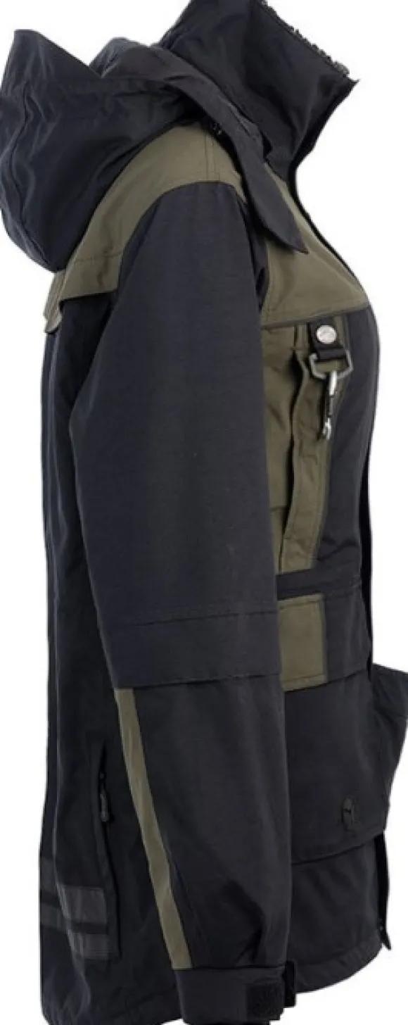 Takissa on irrotettava namitasku, jota voidaan käyttää erikseen vyöllä. Oikeanpuoleisessa etutaskussa on myös annosteluaukko koirankakkapusseille. Hihansuut ovat neulottuja resoreja peukalorei'illä – erittäin arvostettu kylmällä säällä.