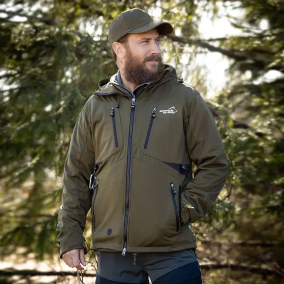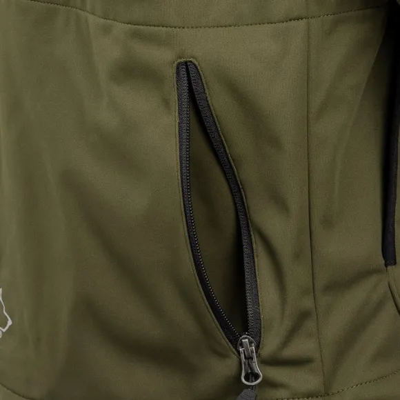 Koiranohjaajan vedenpitävä softshelltakki, paljon taskuja.