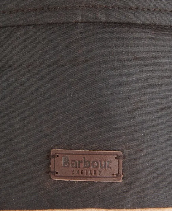 Korvaläpät voidaan tarvittaessa kiinnittää pään taakse. Morar-hatussa on Barbourin kohokuvioitu logo takana.