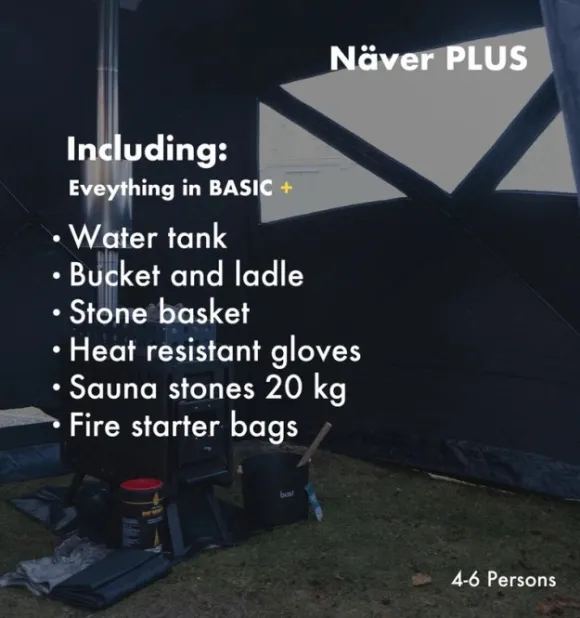 Näver on pienempi saunateltta 4–6 hengelle ja se toimitetaan tehokkaan kamiinan kanssa, joka tarjoaa ylivoimaisen lämmitystehon, sekä runsailla lisävarusteilla. Kamiina voi lämmittää saunateltan yli 90 asteeseen.