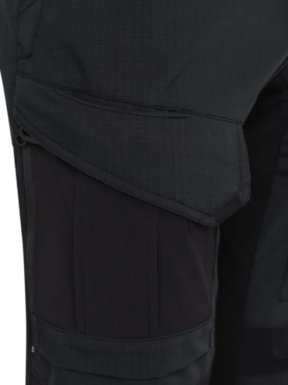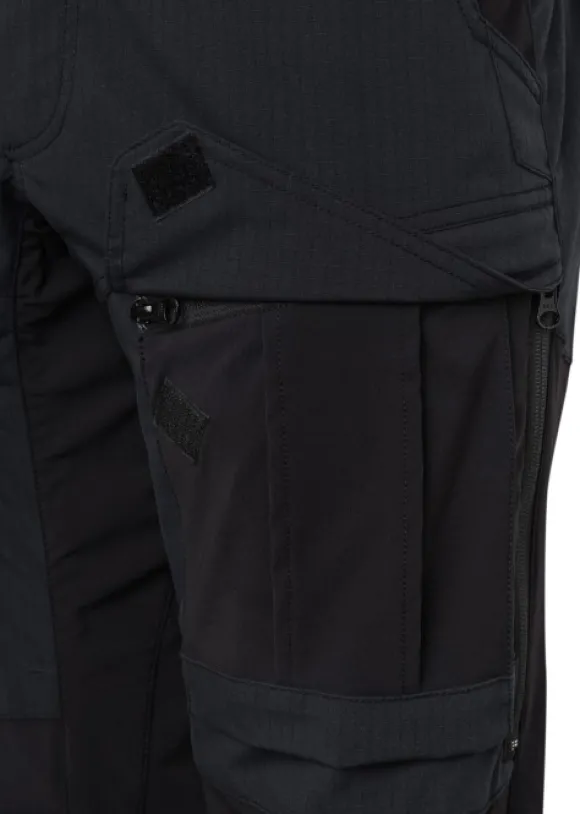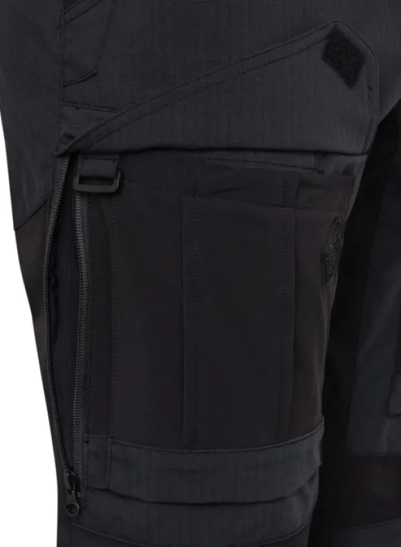 Muotoillut polvet sisältävät polvisuojataskut, jotka ovat käytettävissä ulkopuolelta, ja lisäventilaatiota tarjoavat vetoketjulliset aukot sivuilla.