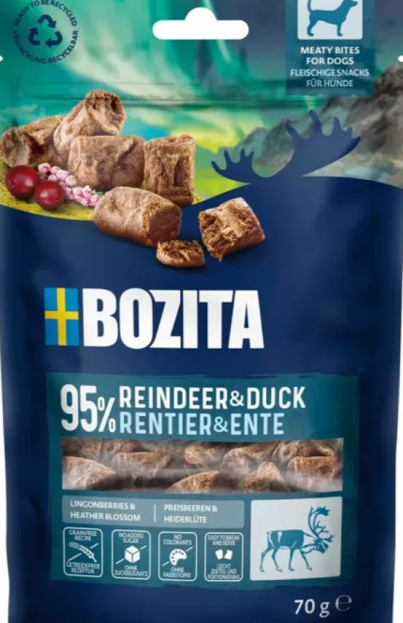 Bozitan Meaty Bites on viljaton premium-herkku, joka sisältää 95 % peuraa ja ankkaa. Herkku on hienostunut ripauksella puolukkaa ja kanervaa – täydellinen ja luonnollinen herkku, jossa maistuvat pohjoisen erämaan maut.