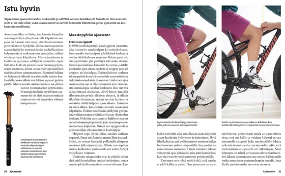Tämä tieto- ja taitopaketti sisältää polkunsa alussa olevan maastopyöräilijän tarvitsemat opit. Se auttaa valitsemaan oikeanlaisen uuden tai käytetyn pyörän juuri sinun tarpeisiisi. Opit varustautumaan ajolenkeille ympäri vuoden, ajamaan haastavassakin maastossa ja ohittamaan esteet turvallisesti sekä säätämään, huoltamaan ja korjaamaan uskollisen ratsusi. Kirja opastaa myös pyöräretkelle yhdessä lasten kanssa.