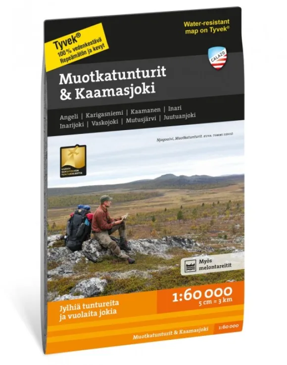 Käytämme kartoissamme laserkeilausaineistoa, minkä ansiosta maastotiedot korkeuskäyrineen ovat aiempaa tarkkapiirtoisemmat. Kartat painetaan Tyvek-materiaalille, joka on vedenkestävää ja repeämätöntä. Lehtijaon ansiosta kaikki alueen tärkeimmät retkikohteet mahtuvat yhdelle kartalle. Suhde 1:60 000.
