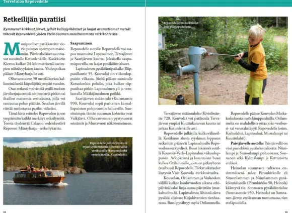 Kirkasvetiset järvet, jylhät kalliojyrkänteet ja osin koskemattomina säilyneet metsät tekevät Repovedestä yhden Etelä-Suomen upeimmista luontokohteista. Retkeilijää hellitään mainioilla reiteillä ja taukopaikoilla niin kansallispuistossa kuin sen ympäristössä. Alueen yrittäjät tarjoavat korkeatasoisia retkeilypalveluita välinevuokrauksesta opastettuihin retkiin, mikä helpottaa retkelle lähtöä.