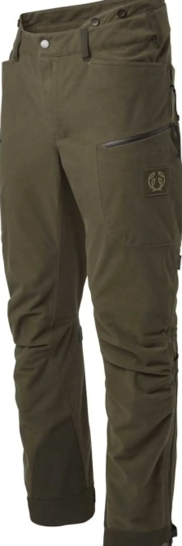 Näissä metsästyshousuissa on ergonominen istuvuus esimuotoilluilla polvilla, ja lahkeiden leveyttä voi säätää tarranauhalla sekä polvien alapuolelta että lahkeiden suusta.