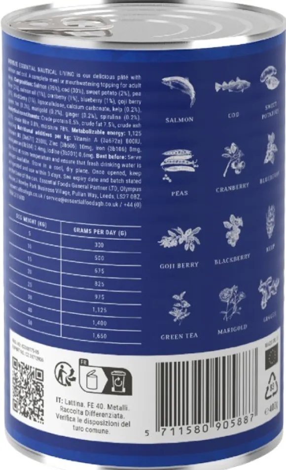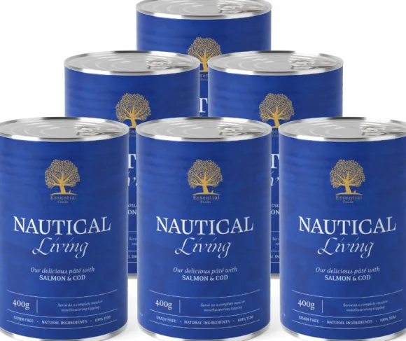 ESSENTIAL FOODS Nautical Living Pâté on herkullinen paté lohen ja turskan maulla – aikuisille koirille. Voidaan tarjoilla täysravintona tai herkullisena lisukkeena.