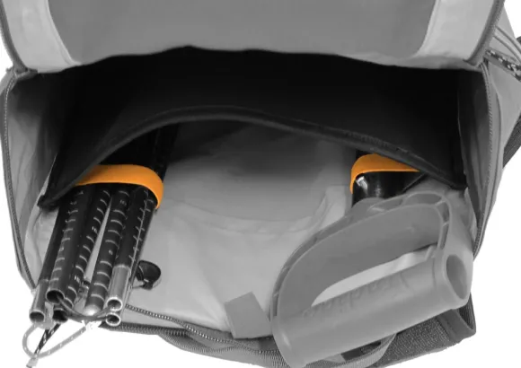 Vesitiiviistä teipatuista saumoista johtuen sisältö pysyy kuivana. Suuri vetoketjulla varustettu aukko mahdollistaa nopean pääsyn isoon päälokeroon.