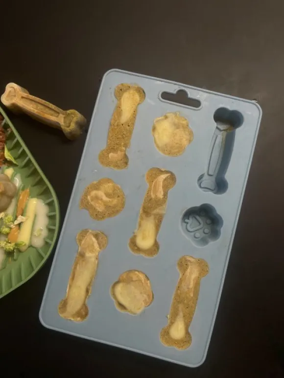 Täytä muotti haluamallasi sisällöllä ja aseta se pakastimeen muutamaksi tunniksi. Voit myös täyttää muotin herkkupaloilla, kuivamuonalla, tuoreella ruoalla, hedelmillä tai muilla koirasi suosikkimakupaloilla.