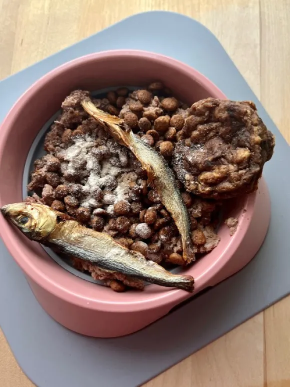 Koiran kupissa on liukumattomat silikonijalat (toimitetaan pussissa kulhon alla).