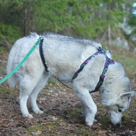 Lukitustoiminto estää koiraa peruuttamasta tai irrottautumasta valjaista. Säädettävä vyölukko varmistaa turvallisen ja mukavan istuvuuden.