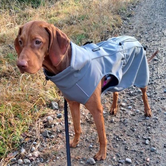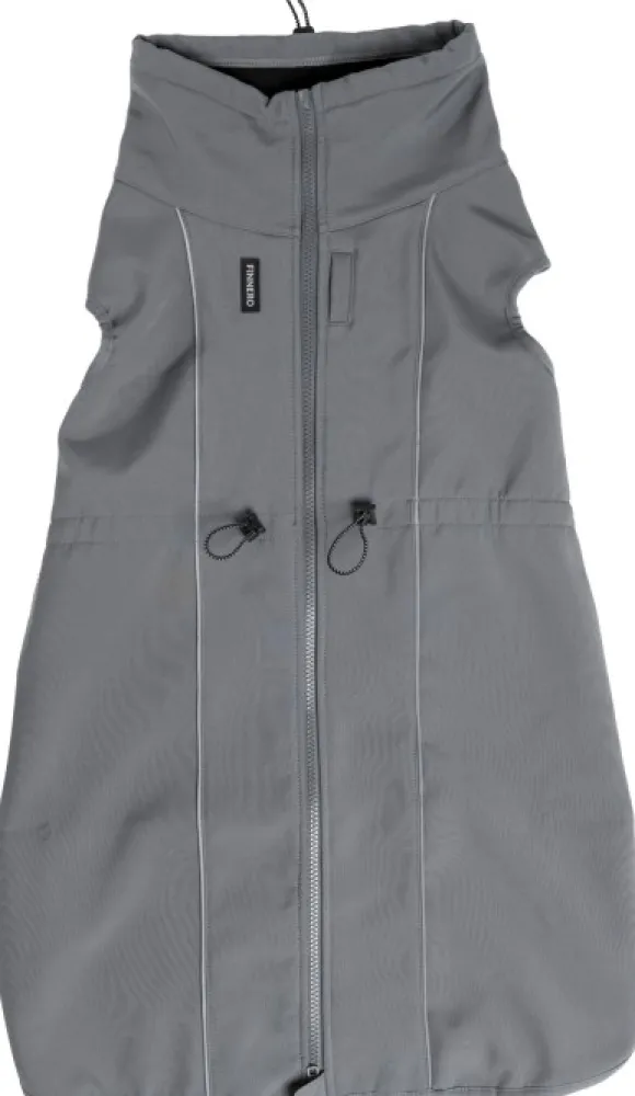 FinNero Softshelltakki Sport on saanut pidennetyn ja uudelleen muotoillun helman paremman peittävyyden takaamiseksi. Takki suojaa tuulelta ja sateelta vettähylkivän kankaan ansiosta. Joustava materiaali mukailee koiran liikkeitä.