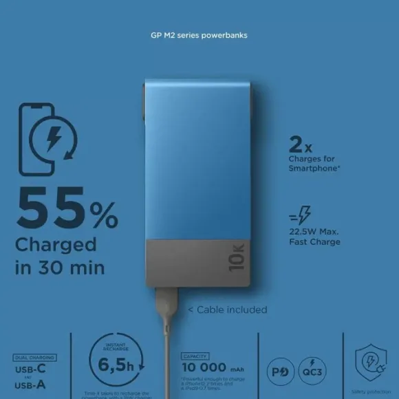 Kahdella sisäänrakennetulla USB-portilla ja kuudella eri turvatoiminnolla varustettuna tämä powerbank on luotettava kumppani monien vuosien ajan.