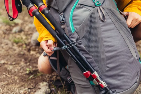 - Säädettävä kiinnityspiste ja ylälukko vaellussauvoille tai jäähakulle