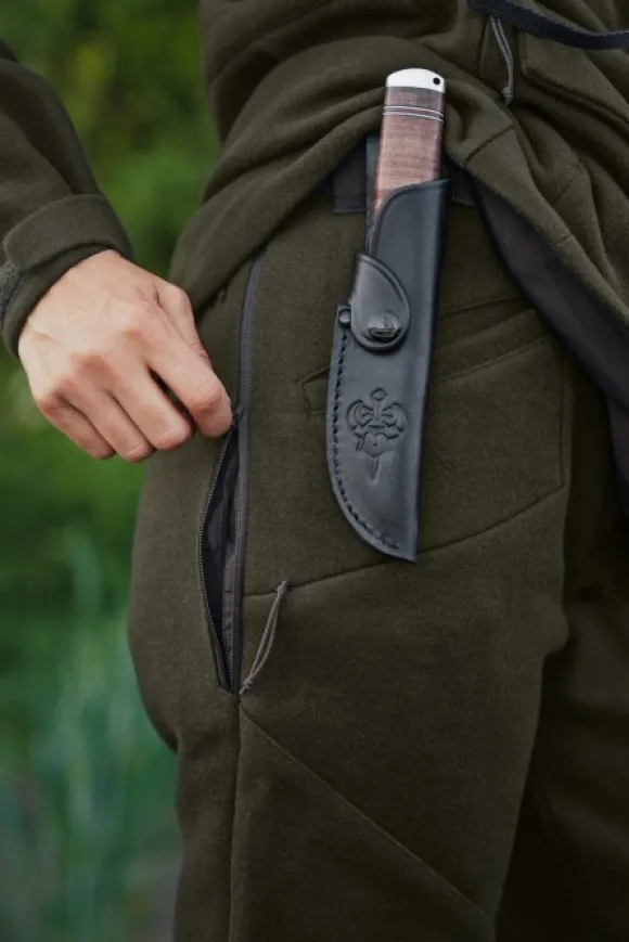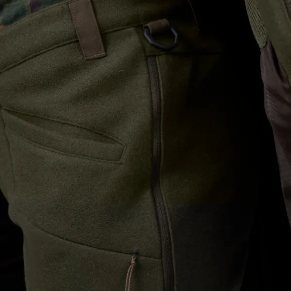 Housuissa on lantiolla tuuletusaukot, joissa on vetoketju ja sisäänommeltu verkkomateriaali, joka päästää ylimääräisen lämmön ulos ilman, että hyönteiset, lehdet tai oksat pääsevät sisään. Vasemmassa lantiossa on vahva D-rengas, johon voit kiinnittää varusteet tai koiran talutushihnan. Housuissa on kaksi avotaskua edessä ja vetoketjulliset lisätaskut molemmissa reisissä. Oikeassa reisitaskussa on sisäänommeltu patruunapidike, johon mahtuu neljä patruunaa.