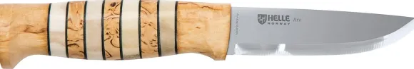 Kahvassa on pieni, mutta erottuva sormisuoja ja keskikokoinen terä hienoimmasta Helle-teräksestä, joka on kolminkertaisesti laminoitu. Hiottu käsin veitsenteräväksi.