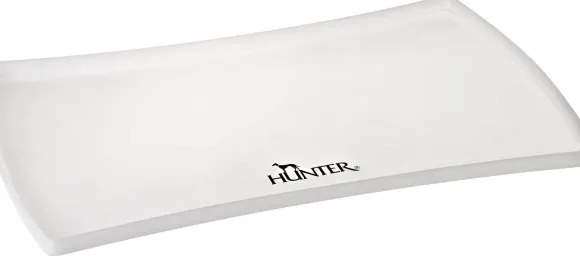Läpinäkyvästä silikonista valmistettu alusta HUNTER-painatuksella. Kestävä materiaali, joka on konepestävää. Taitettu reuna suojaa esimerkiksi lattiaa sotkulta.