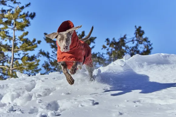 Lämpötakki suojaa koirasi turkkia hyvin ja estää tuulenpuuskia – vähän kuin supersankarin asu, kun taas pehmeä ja korkea trikoo-huppu suojaa ja lämmittää koiran niskaa ja korvia.