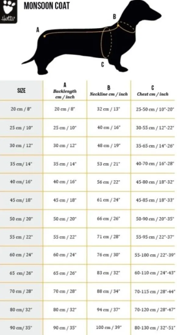 Suuret heijastavat printit takin takana ja 3M heijastimet selässä lisäävät turvallisuutta ja näkyvyyttä pimeässä. Monsoon-takin erinomainen muotoilu takaa hyvän istuvuuden useimmille roduille. Vatsakappaleen leveä muoto pitää takin paikoillaan ja se pysyy koiran päällä myös villimpien leikkien aikana ilman, että se rajoittaa koiran liikkeitä. Hyvin peittävä vatsakappale suojaa vatsaa tehokkaasti lialta ja hiekalta. Monsoon on valmistettu joustavasta ja äänettömästä kankaasta, se mukava käyttää ja nopea pukea.