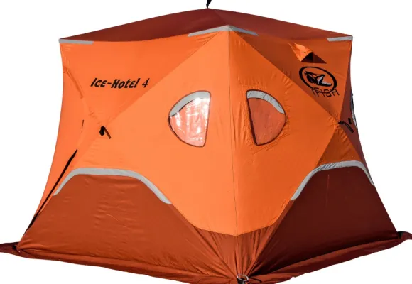 Eristetty pilkkiteltta on 35% lämpimämpi, ja on kätevä ottaa mukaan pilkkireissulle sen suojatessa kovalta tuulelta ja huonolta säältä. Ice Hotel 4 on valmistettu kestävästä 600D nailonista vahvikkeilla, kuusi ikkunaa ja kaksi ovea. Suuri lattiapinta-ala (5,5 M²). Kahdeksan kiinnitysruuvia ja käytännöllinen säilytyskassi.