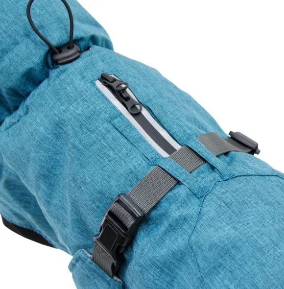 Vedenpitävä vetoketjullinen valjaiden aukko mahdollistaa valjaiden käytön takin alla. Taluttimen voi kiinnittää myös kauluksessa olevan aukon kautta. Suuret heijastimet lisäävät näkyvyyttä pimeässä. Takana olevaan vapaaseen silmukkaan voi kiinnittää lisävalaistusta.
