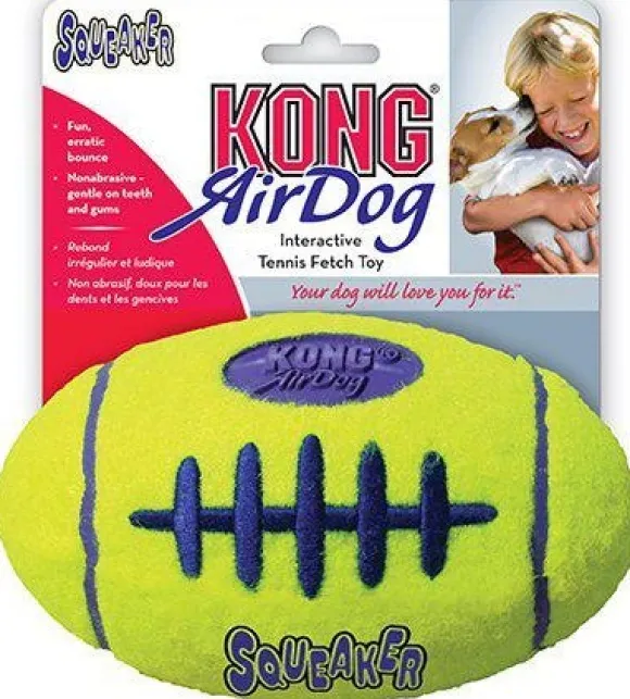 Kong AirDog® Squeaker Football yhdistää kaksi klassista koiran lelua – tennispallo ja vinkulelu – luodakseen täydellisen noutolelun.