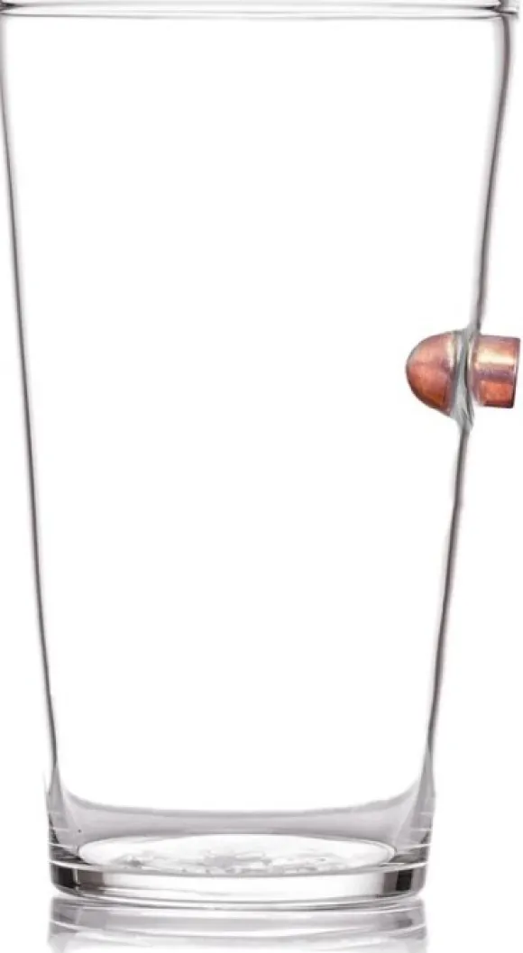 Lucky Shotin käsintehty olutlasi on varustettu aidolla .45 luodilla, joka on upotettu lasin sivulle.