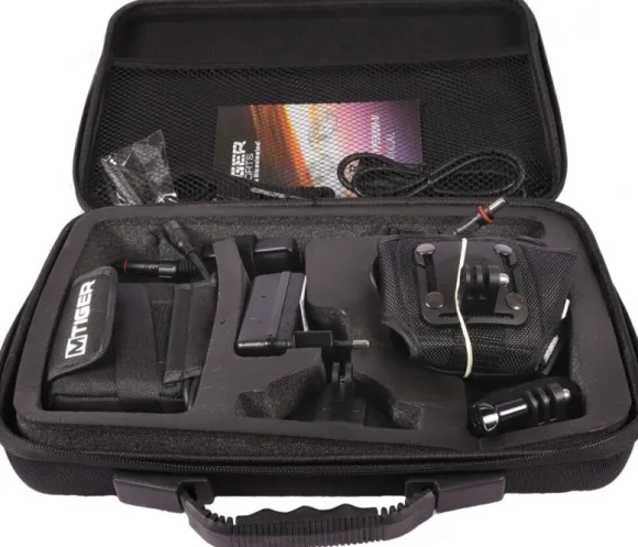 Pakettiin kuuluu: lamppu, akku, laturi, kaukosäädin, kotelo akulle, pääteline (Pro-III, nailon & neopreeni & elastinen hihna), pyöräilykypärän kiinnityshihna, peukaloruuvi lampun kiinnitystä varten, ohjaustangon teline sekä säilytyslaukku.