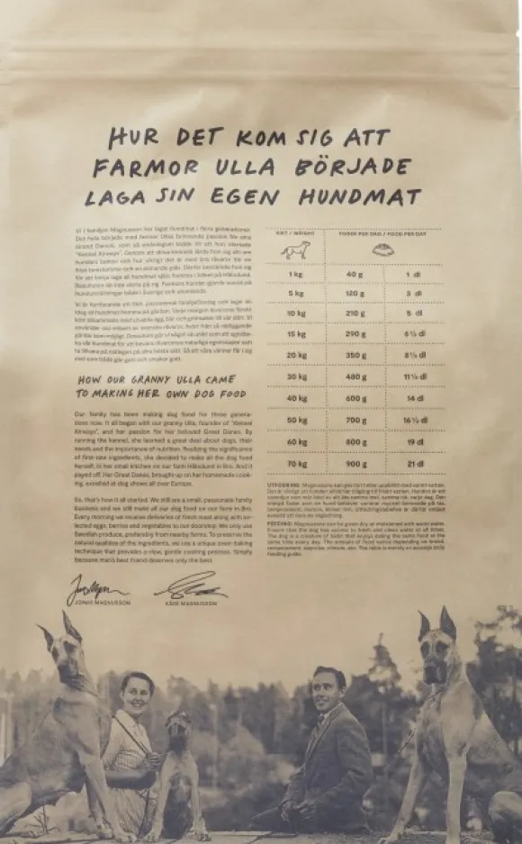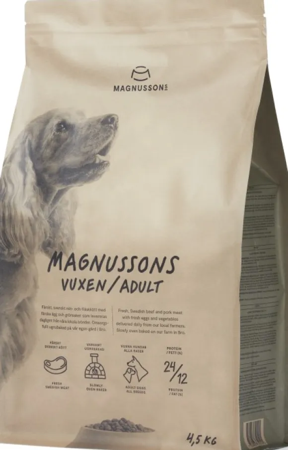 Magnusson Meat & Biscuit Adult on täysrehu täysikasvuisille koirille, joiden aktiivisuustaso on normaali tai korkea. Se sopii myös suurikokoisille roduille kasvuvaiheessa. Ruoka on hitaasti uunissa kypsytettyä kuivaruokaa, johon on käytetty ainoastaan tuoretta ruotsalaista lihaa. Se on korkealaatuista ja maistuvaa koiranruokaa!