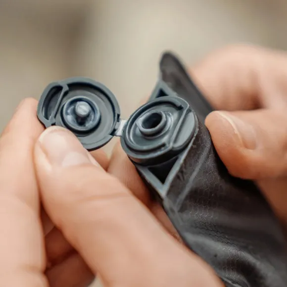 Valmistettu vedenpitävästä Cordura-ripstop-nylonista, jonka pinnoite hylkii vettä ja kuivuu nopeasti. Kierrekorkin ansiosta siinä on suuri täyttöaukko. Lenkin päälle voi kirjoittaa pullon sisällön.