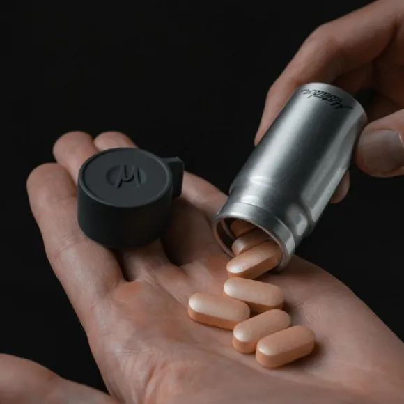 Kestävä ja kevyt alumiini on suunniteltu kestämään matkustuksen vaatimuksia. Helppokäyttöinen silikonikansi sulkee tiiviisti ja pitää sisällön turvassa. Kapseli ei kuitenkaan ole tarkoitettu nesteiden säilyttämiseen.