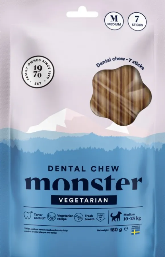 Aktiiviset mineraalit vähentävät hammaskiven ja plakin muodostumista jopa 80 %. Monster Dog Dental Chew Vegan on täysin kasvipohjainen ja on suunniteltu erityisesti 10 – 25 kg painaville koirille.