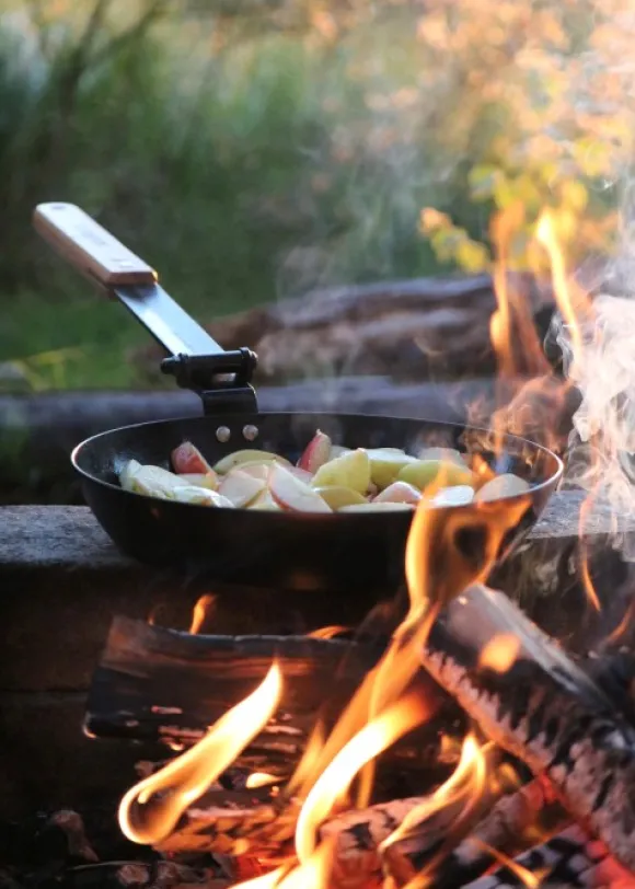 Näppärä paistinpannu taittuvalla varrella. Pannu vie vain vähän tilaa laukussasi. Pannussa on korkea reuna, jotta ruoka pysyisi siinä paremmin. Kulkee mukana retkelle, mökille tai leiripaikalle näppärässä suojapussissa.