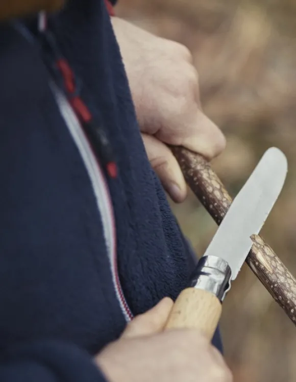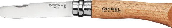 My first Opinel -veitsessä on 8 cm pitkä terä, joka on valmistettu ruotsalaisesta Sandvikin 12C27-ruostumattomasta teräksestä. Veitsessä on pyöristetty kärki ja ranskalaista pyökkiä oleva kahva.