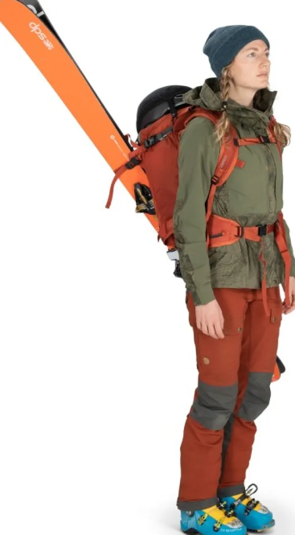 Voit kantaa suksia diagonaalisesti tai A-kehyksenä mieltymyksesi mukaan. Lumilauta voidaan myös kiinnittää pysty- tai vaakasuoraan. Tämä on yksinkertaisesti kompakti mutta erittäin toiminnallinen selkäreppu, jossa on kaikki yksityiskohdat, joita voit toivoa täyden päivän vuorilla.