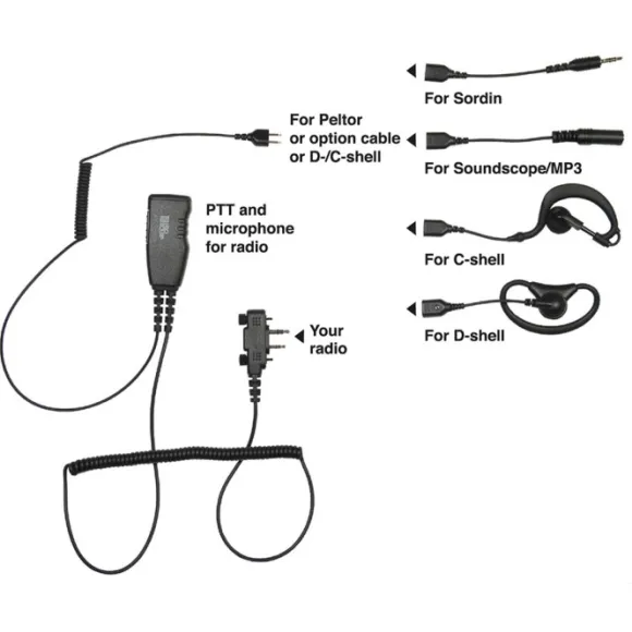 Kuulokkeet C- ja D-tyypillä tai liitännällä Peltor-, Sordin- ja Soundscope-kuulokkeille. Kuulokkeissa on myös musta PTT-painike, jossa on sisäänrakennettu mikrofoni.