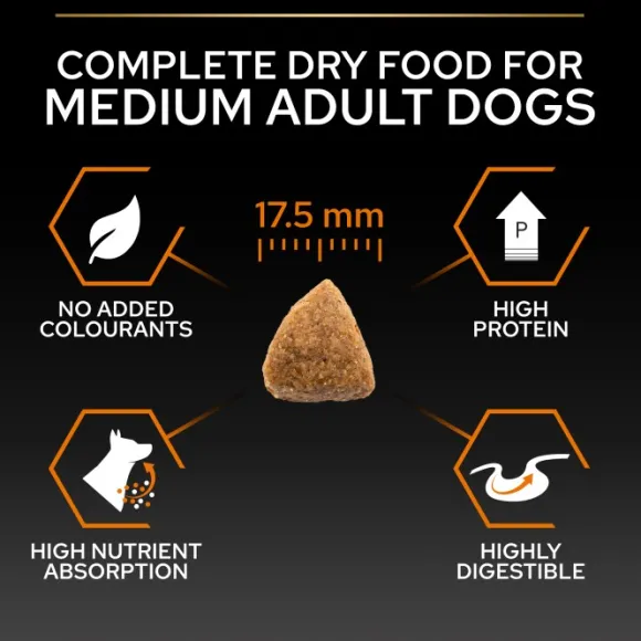 PURINA PRO PLAN DOG Medium Adult with OPTIBALANCE on täysravinto, joka on kehitetty keskisuurille aikuisille koirille. Tämä kuivaruoka sisältää runsaasti kanaa, ja sen ainesosat on erityisesti valittu vastaamaan koiran kaikkiin ravintoainetarpeisiin osana aktiivista elämäntapaa.