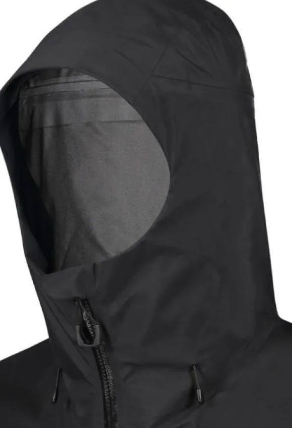 Huppu on täysin säädettävissä, ja sen yläosa on vahvistettu, joten se on erityisen suojaava. Edessä on vedenpitävä vetoketju, jossa sisäinen myrskysuoja sekä fleecevuorattu, mukavuutta lisäävä leukasuoja. Hihojen alla on kaksisuuntaiset ventilaatiovetoketjut lämpötilan säätöön. Etutaskuissa on vedenpitävät vetoketjut, ja hihansuut ovat säädettävissä tarranauhalla.