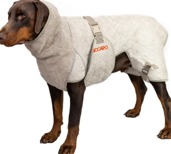Siccaron Solution Drying Robe on erittäin imukykyinen ja ergonomisesti muotoiltu kuivausloimi koirille. Solution-kuivausloimi on muotoiltu uudelleen asiakkaiden toiveiden ja palautteen perusteella. Uusi malli on 20 % peittävämpi kuin edeltäjänsä, joten se peittää hyvin myös koiran takaraajat. Erityisen hyvin tämä loimi sopii esimerkiksi kultaisillenoutajille, spanieleille ja settereille, mutta yhtä hyvin se käy myös muille koiraroduille. Ergonomisesti istuvassa loimen saumoissa on heijastavaa lankaa, joka parantaa näkyvyyttä pimeällä. Lisäksi loimessa on uudet optimoidut hakaset sekä kestävät, luistamattomat soljet. Kaulassa on aukko talutushihnalle.