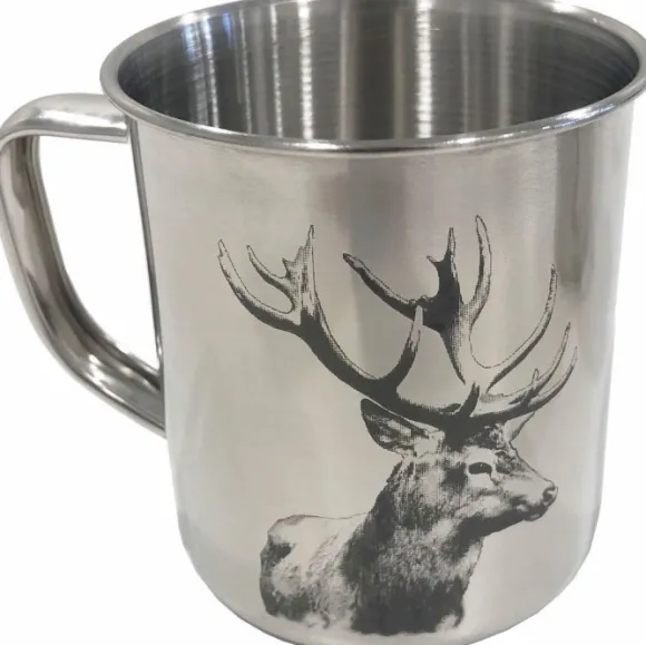 Stabilothermin peuran kuvalla koristeltu, ruostumattomasta teräksestä valmistettu retkimuki. Kestävän ja kevyen mukin voi pestä tiskikoneessa.