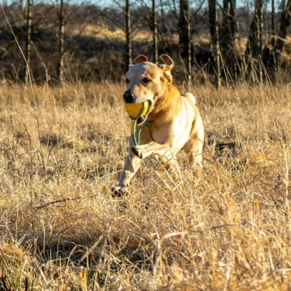 Käytännössä tuhoutumaton Durafoam-pallo, joka on kiinnitetty köyteen noutoleikkejä varten.